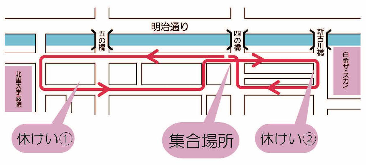 ルート:田島町一周(会館前→北里手前→四ノ橋広場→大久保通り→会館前:約1.4km、途中、給水休憩2回)