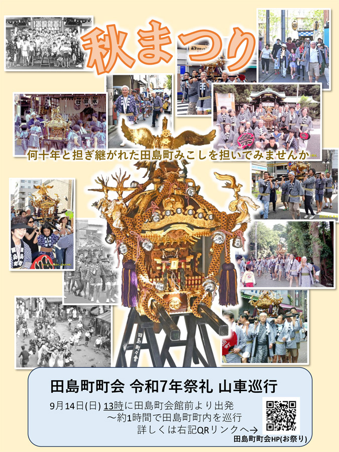 田島町町会の祭礼イベントにご支援ご協力をいただいた方々、山車巡行へのご参加いただいた方々、および、神酒所の設営、運営、撤収にご協力いただいた方々に厚く御礼申し上げます。